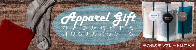 透明のチャック袋にTシャツを入れてリボンを巻いたラッピングパッケージ。背面にクラフトペーパーを入れてナチュラル感を演出しています。ラベルは無料ラベル印刷ソフト「お手軽プリント」を使ってインクジェットプリンタで一枚から作れます。